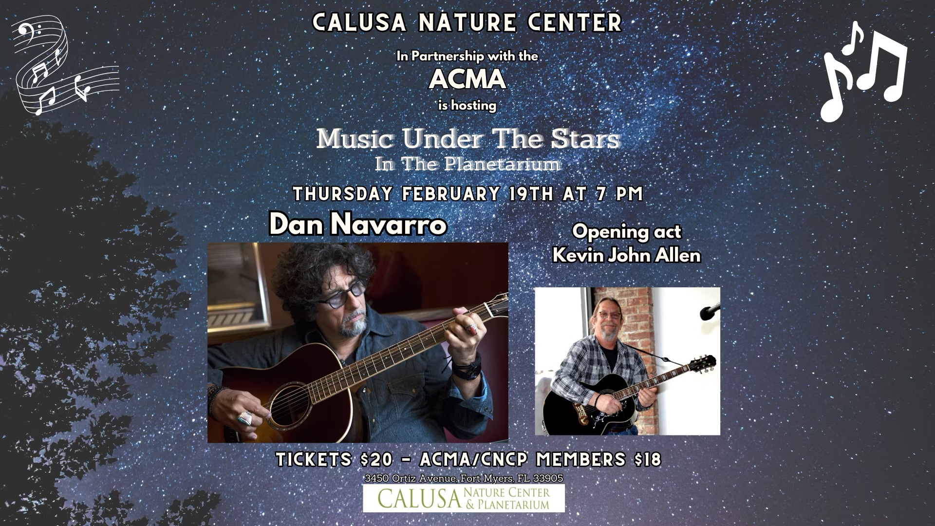The ACMA and the Calusa Nature Center are thrilled to welcome Dan Navarro and Kevin John Allen to the Music Under the Stars series.